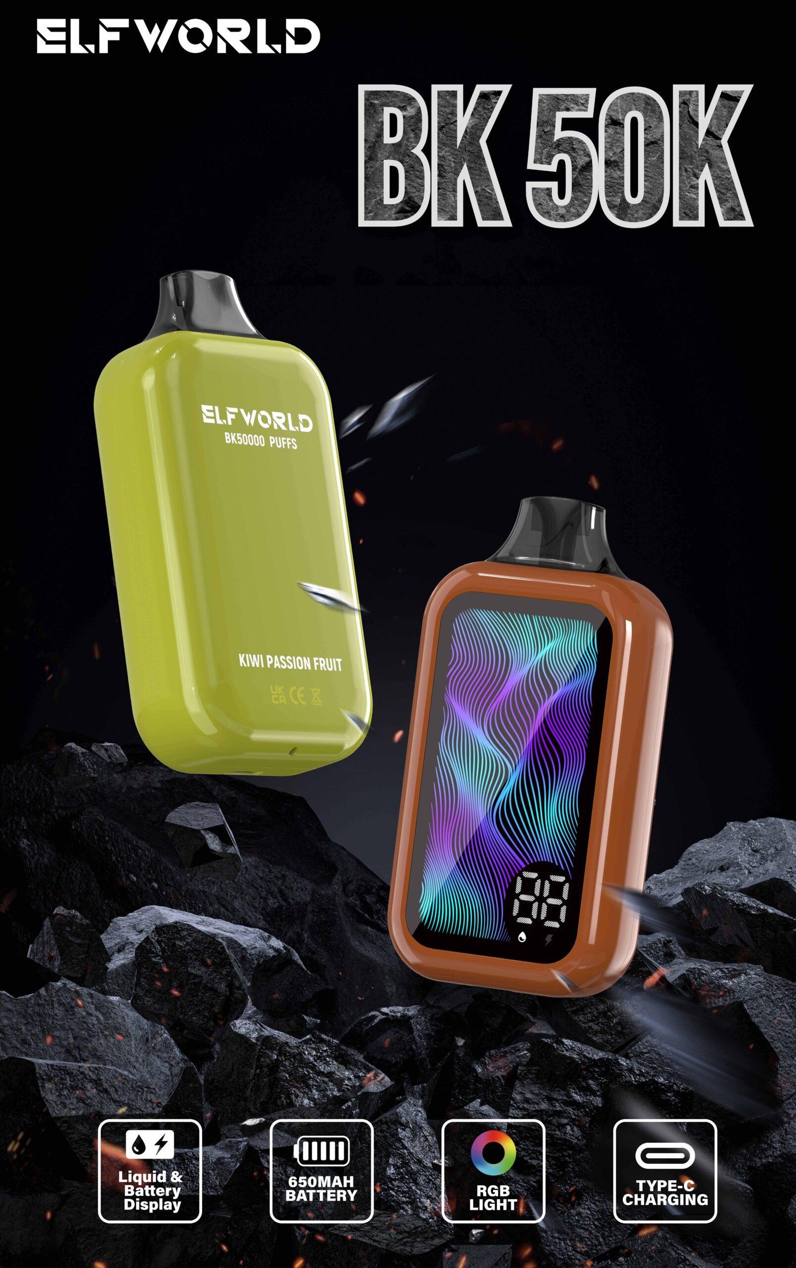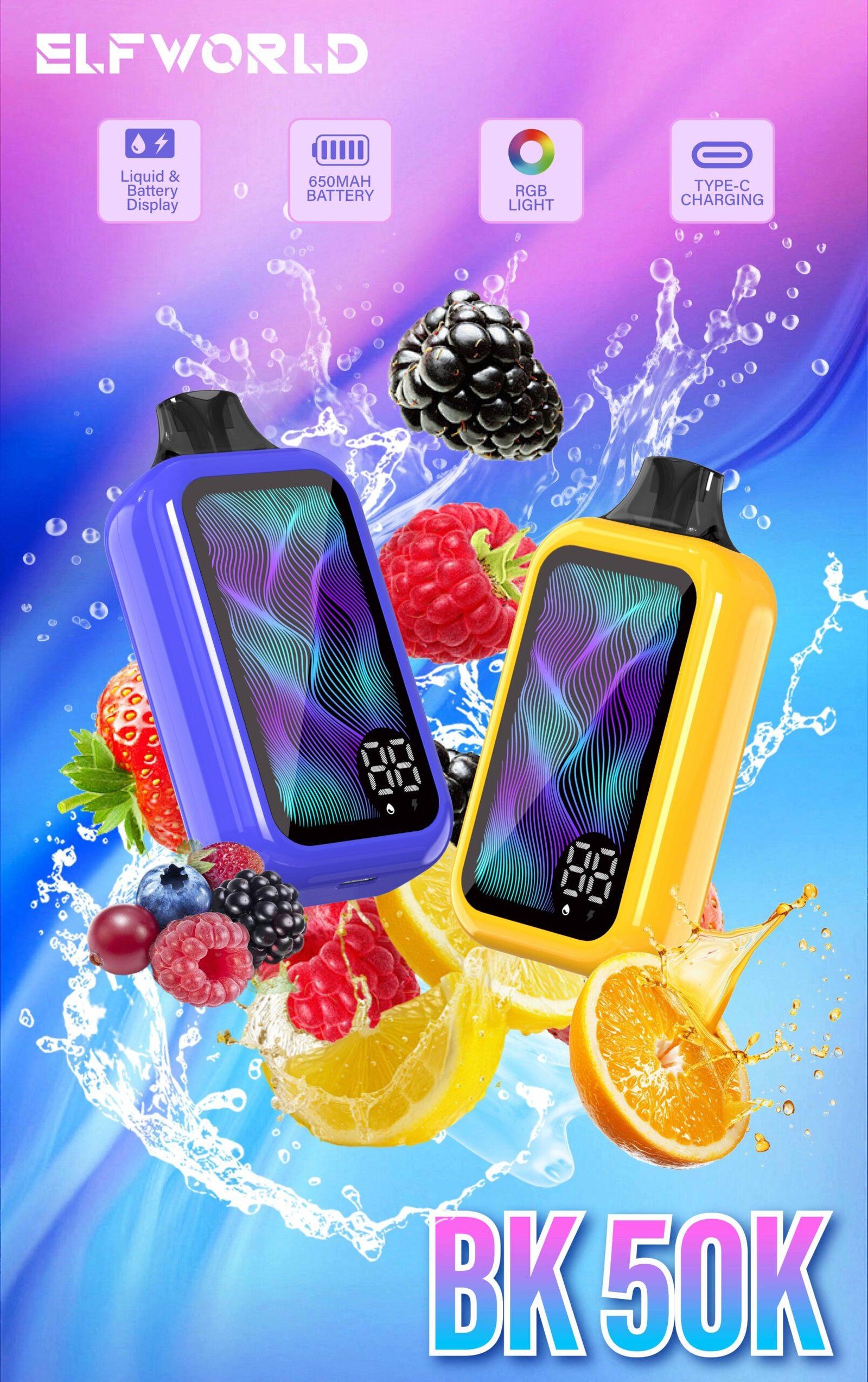 - Smart Display & Lighting: Stay informed with the integrated battery and liquid display vape screen, a key feature in this rechargeable disposable vape 50000. Plus, turn heads with the eye-catching RGB display disposable vape and full screen RGB light, setting the Elfworld BK50000 disposable vape apart from the rest.